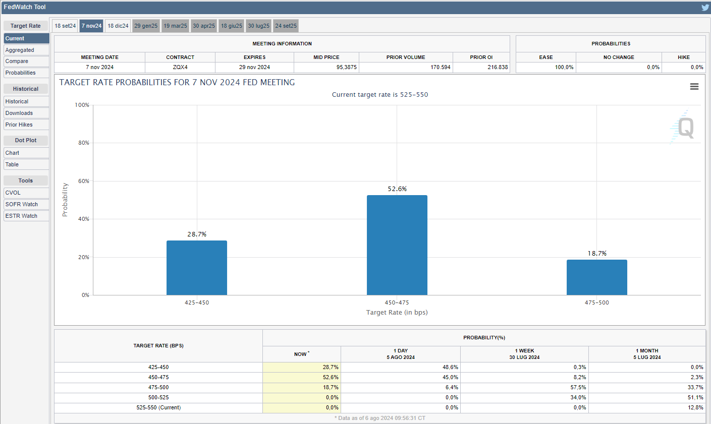 E veniamo alla scadenza relativa alla riunione del 7 novembre. Nella quale a comandare sono ora le probabilità per un taglio per complessivi 75 bps (1 da 0,50% e uno da 0,25%) che dall’8% di due venerdì fa balzano all’attuale 52,6%. Addirittura troviamo al 28,7% le probabilità di un taglio di un punto percentuale (0,50% + 0,50%), mentre scendono dal 57,5% di due venerdì fa all’attuale 18,7% le probabilità per un taglio di soli 50 bps (50 bps o due da 25 bps) (v. grafico):