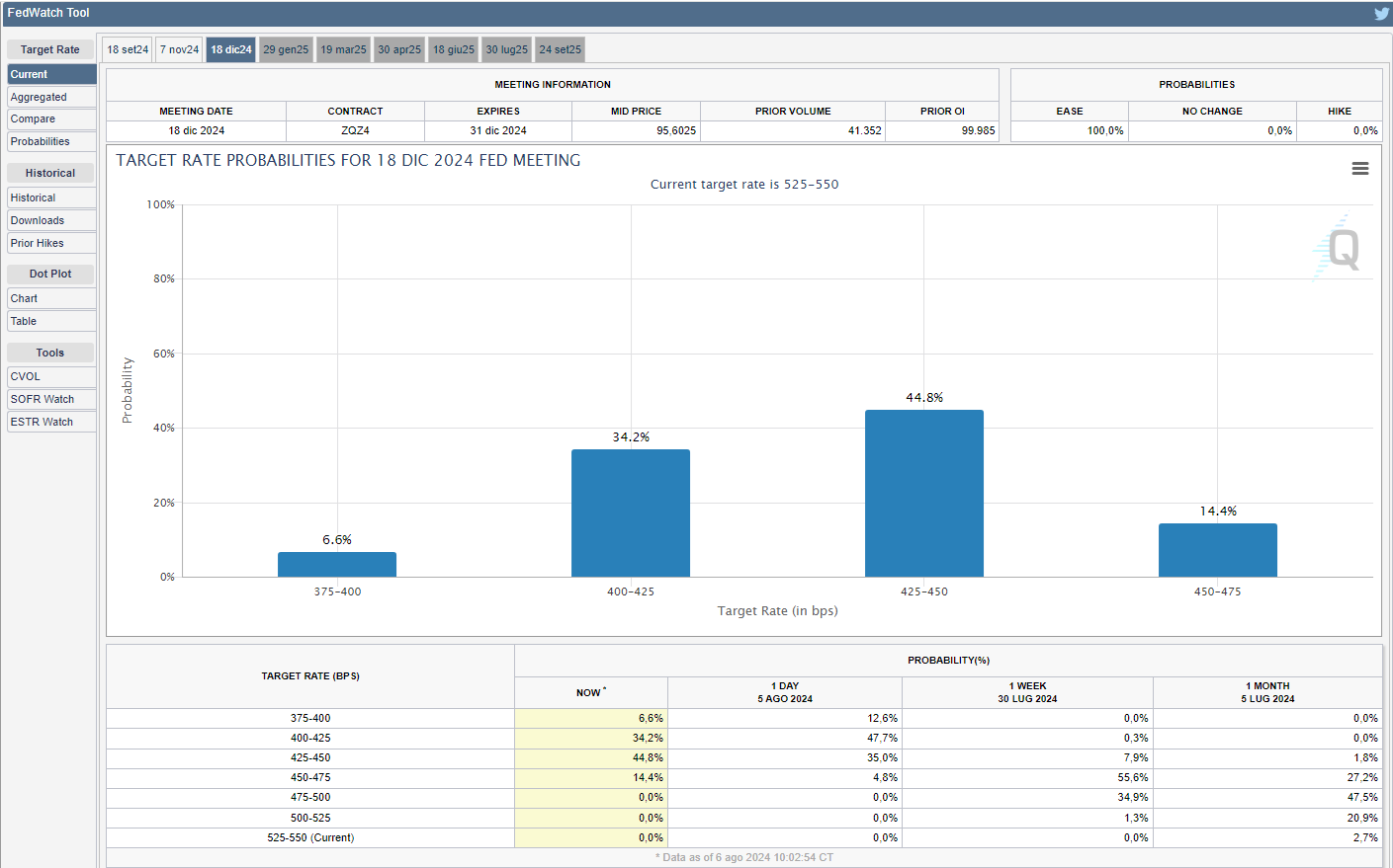 E passiamo ai rendimenti dei Treasury USA che dopo i deboli dati sul mercato del lavoro USA di venerdì scorso e il ‘carry trade’ di ieri con lo Yen, i rendimenti dei Treasury e dei Bonds in generale hanno tracollato facendo registrare minimi che non si vedevano dal 2023, per poi riprendersi un po' tra la chiusura di ieri sera e oggi. Nello specifico, come detto, il Treasury 2Y è quello che ha sofferto di più passando dal 4,404% di due lunedì fa all’attuale 4,027%, con un minimo intraday di ieri a 3,656% (minimo di marzo 2023).