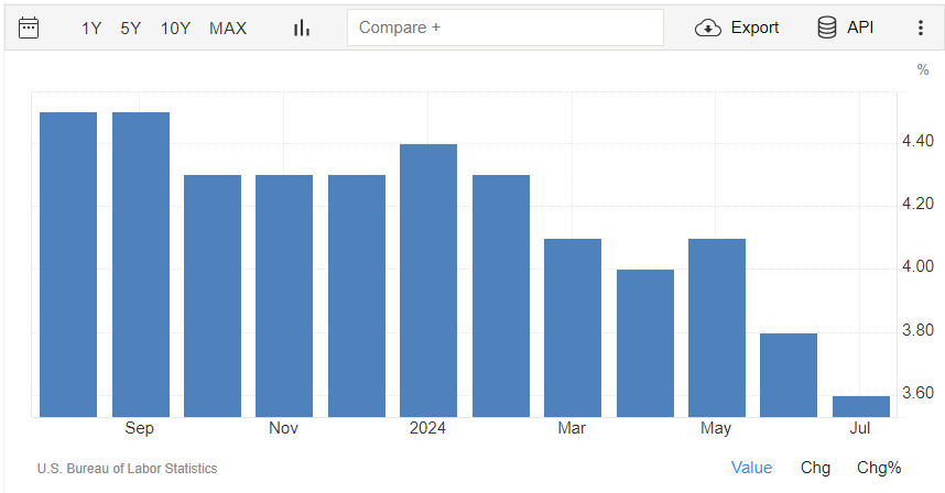 Il tasso di disoccupazione a luglio è al 4,3% (dato più alto dal ottobre 2021), sopra al consensus del 4,1% ed in crescita rispetto alla rilevazione di giugno del 4,1%. Il dato è rilasciato dall’U.S. Bureau of Labor Statistics.
