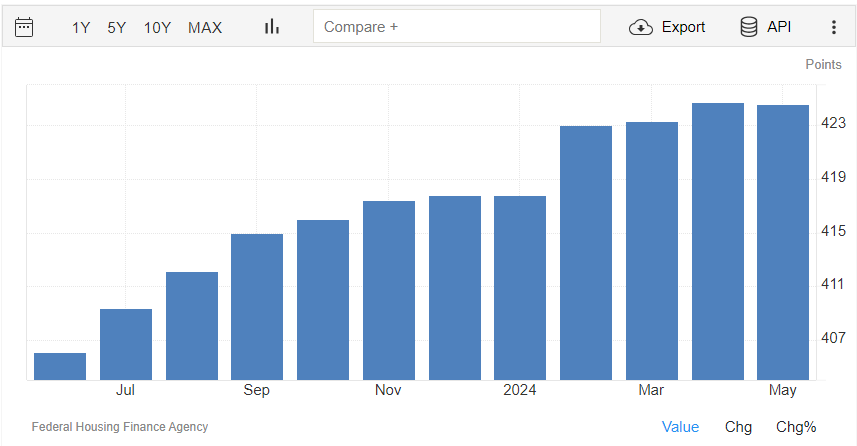 L’indice di prezzo delle case a maggio si attesta a quota 424,6 punti, restando quasi precisamente in linea con la rilevazione di aprile di 424,7 punti (rivista da 424,3 punti). Il dato è rilasciato dalla Federal Housing Finance Agency.