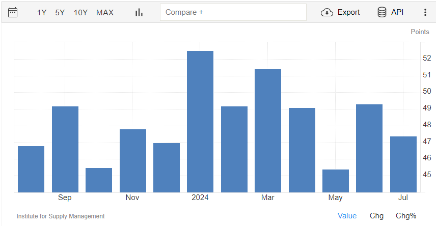 L’indice rilasciato da ISM relativo ai nuovi ordini nel settore manifatturiero, invece, a luglio si attesta a quota 47,4 punti, in calo rispetto ai 49,3 punti di giugno.