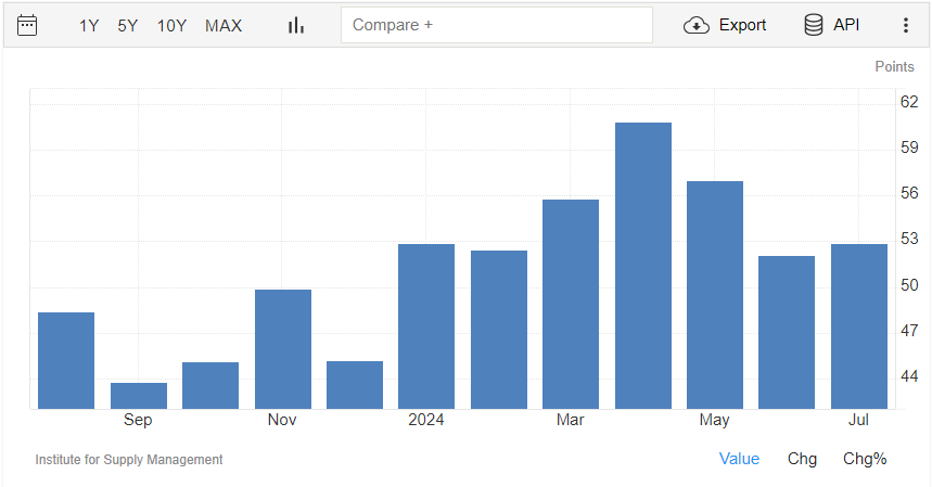 Il dato sui prezzi del settore manifatturiero rilasciato da ISM a luglio è pari a 52,9 punti, in crescita rispetto ai 52,1 punti di giugno.