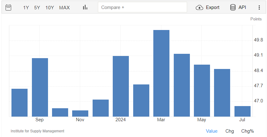 Il PMI manifatturiero rilasciato da ISM a luglio si attesta a quota 46,8 punti, con una contrazione rispetto ai 48,5 punti di giugno ed attestandosi sotto al consensus di 48,8 punti.