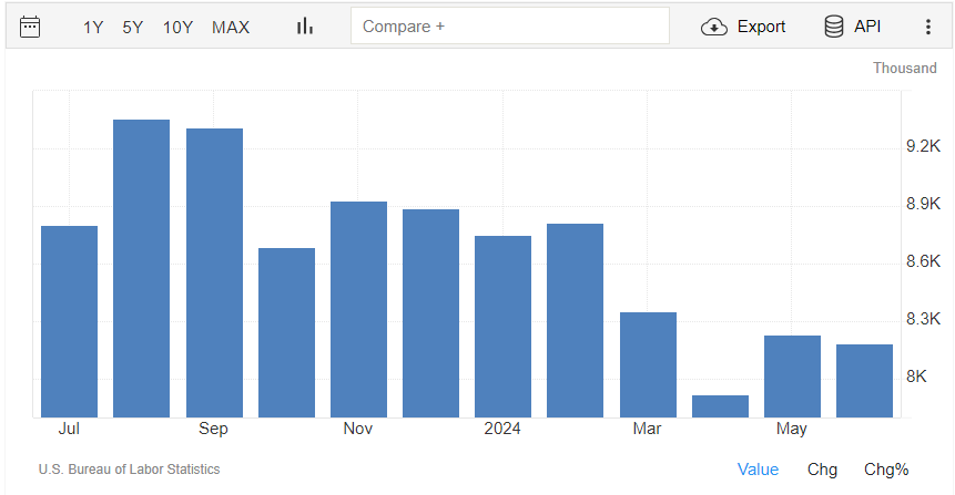 Il JOLTs Job Openings, un’indagine che serve per misurare il numero di posti di lavoro vacanti raccogliendo dati da datori di lavoro, a giugno si attesta a quota 8,184 milioni; rilevazione che indica un calo rispetto agli 8,230 milioni di maggio (rivisti da 8,140 milioni). Il dato è rilasciato dall’U.S. Bureau of Labor Statistics.