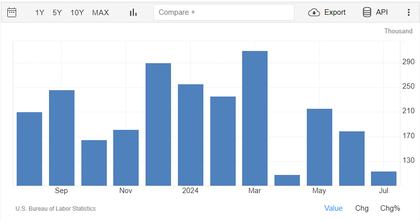 Nel settore non-agricolo a luglio sono stati creati 114 mila posti di lavoro, rilevazione che segna un rallentamento rispetto ai 179 mila di giugno (rivisti da 206 mila). Il dato è rilasciato dall’U.S. Bureau of Labor Statistics.