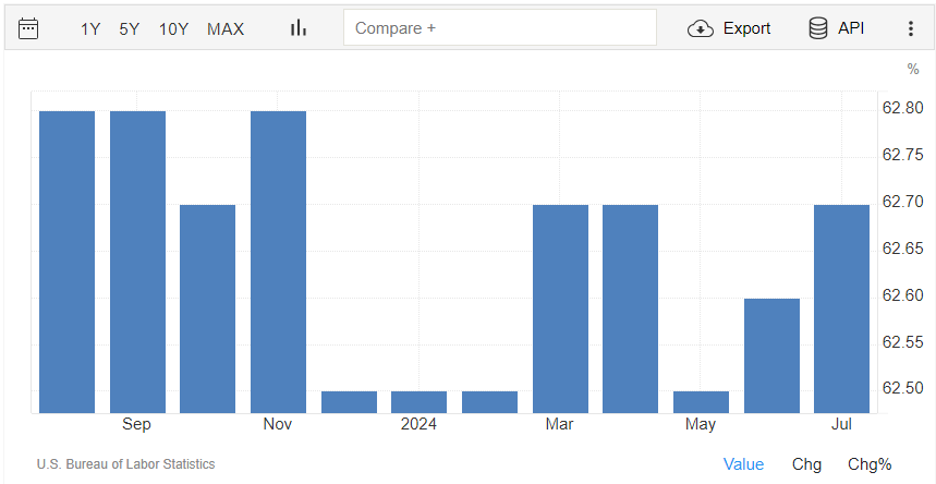 Il tasso di partecipazione della forza lavoro, ovvero la percentuale di popolazione in età lavorativa che sta cercando occupazione o che è già occupata, a luglio tocca quota 62,7%, appena sopra al dato di giugno del 62,6%. Il dato è rilasciato dall’U.S. Bureau of Labor Statistics.