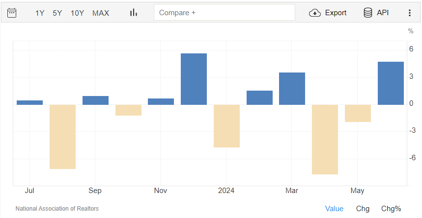 Il dato sulle vendite immobiliari in corso (che misura il cambiamento nel numero di case con contratto di vendita, ma in attesa della transazione di chiusura, escludendo le nuove costruzioni) a livello mensile a giugno cresce del 4,8%, dopo un -1,9% registrato a maggio (rivisto da -2,1%). Il dato è rilasciato dalla National Association of Realtors.