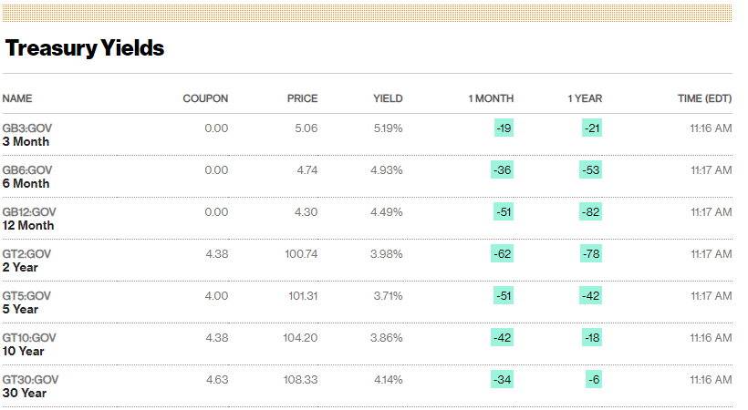 Infine stesso discorso fatto per il 10Y vale anche per la scadenza più lunga del 30Y con il rendimento che passa dal 4,425% di due lunedì fa passa all’attuale 4,149% con un minimo intraday di ieri a 3,999%.