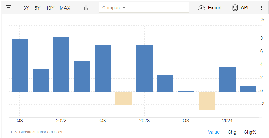 Il dato preliminare del secondo trimestre 2024 relativo ai costi unitari del lavoro indica un +0,9%, in rallentamento rispetto al +3,8% del primo trimestre 2024 (rivisto da +4,0%) e sotto al consensus del +1,8%. Il dato è rilasciato dall’U.S. Bureau of Labor Statistics.
