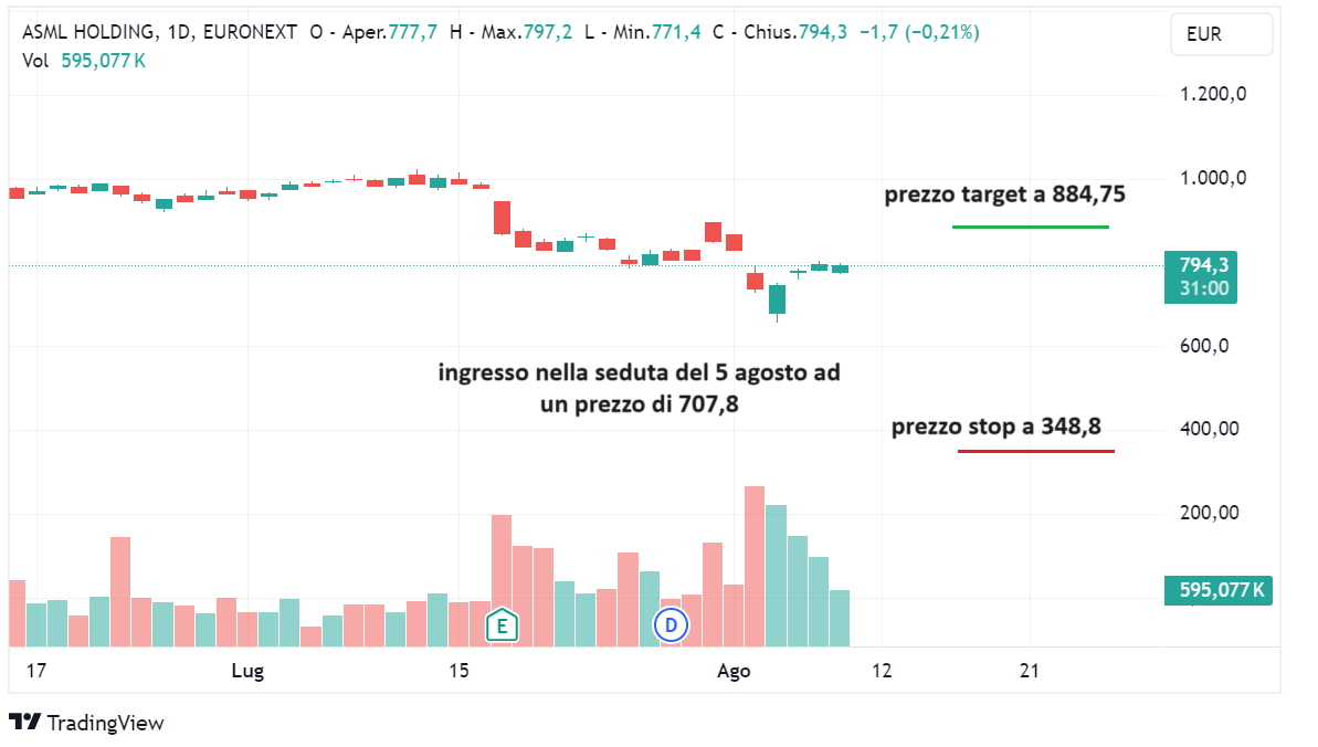 Il titolo è entrato in portafoglio nella seduta del 5 agosto ad un prezzo di 707,8. Il prezzo target è a 884,75 ed il prezzo stop a 348,8.