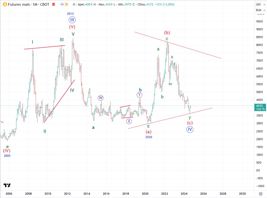 Il mais sta confermando la fine dell’onda [IV] di gran super ciclo e sta impostando un primo 5 onde rialzista.