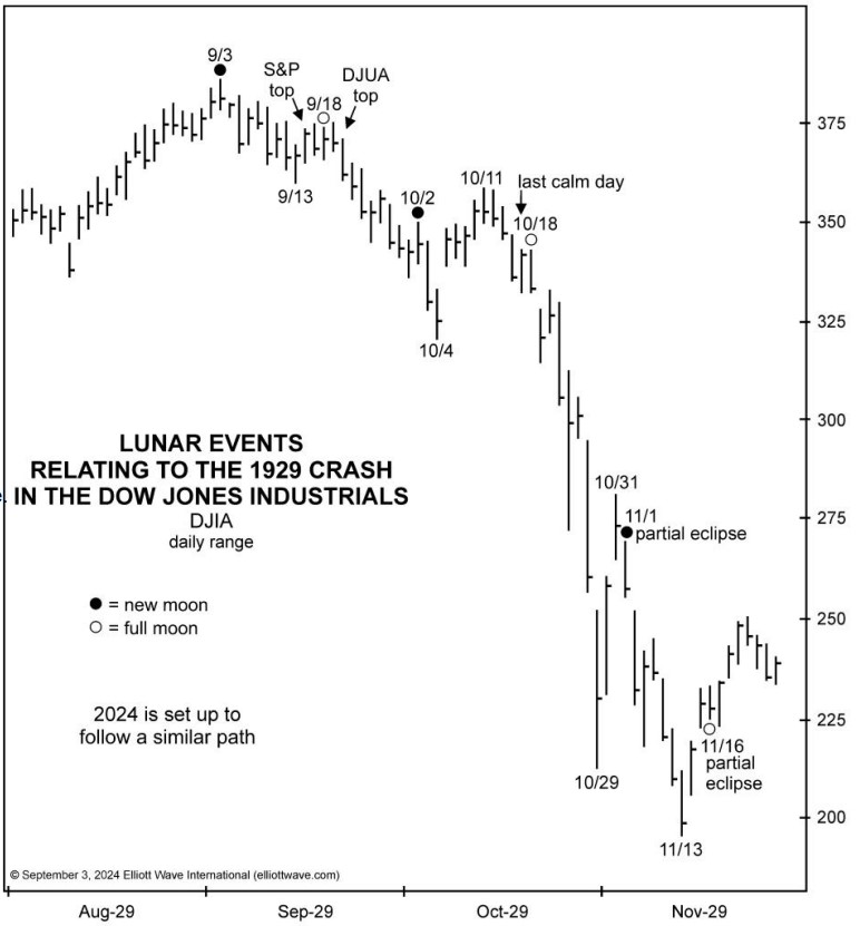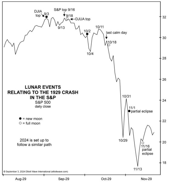 Nel 1929, il mercato ribassista emergente rimase ordinato fino al 17 ottobre, un giorno prima della seconda luna piena del periodo. Fu allora che iniziò il panico. L’altro crollo famoso del 1987 iniziò in modo simile, con un'apertura in gap-down un giorno prima della luna piena e dell'eclissi lunare del 7 ottobre. Quest'anno, la luna piena corrispondente, con un'eclissi lunare vicina, si verifica il 17 ottobre. Se il parallelo regge, il panico dovrebbe iniziare il 16 o il 17 ottobre.