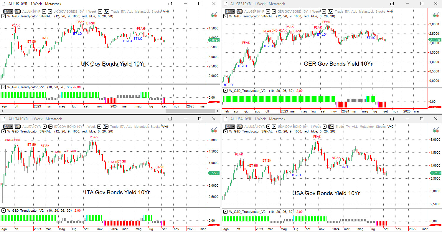 Analizzando con il Trendycator le curve dei rendimenti su scala settimanale dei principali benchmark decennali si confermano le aspettative sull’inizio di un ciclo di tagli dei tassi d’interesse, nonostante il debole rimbalzo dei rendimenti nell’ultima settimana.
