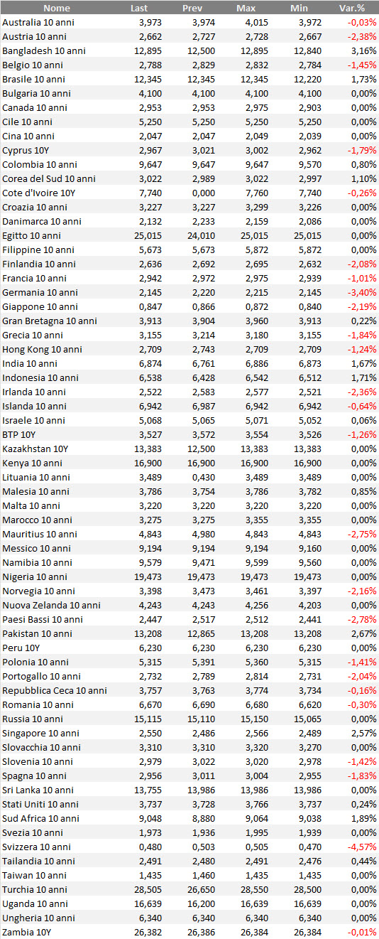 Tabella dei rendimenti, su base settimanale, delle obbligazioni governative mondiali con qualunque rating.