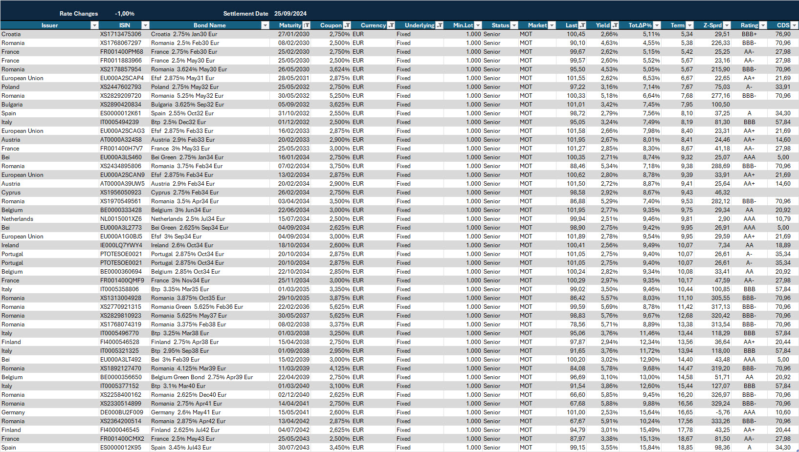 Di seguito una serie di estrazioni dal mio database per un’ottica di investimento per flusso cedolare e rendimento a scadenza di medio/lungo termine. Tutti i titoli selezionati hanno cedola lorda su base annua non inferiore al 2,50%, prezzo non superiore a 102,00 e rendimento a scadenza non inferiore al 2,50% lordo annuo. In base alla personale ottica temporale ed esigenza di finanza personale, scegliere ed eventualmente combinare diverse emissioni.