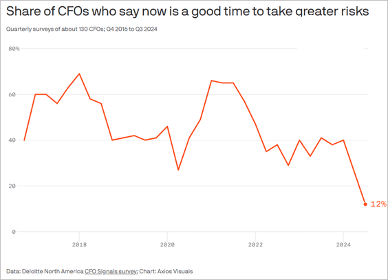 E’ evidente che le elezioni fanno paura perché sondaggio o non sondaggio non sai mai come vanno a finire finché non escono i dati. E di seguito una statistica che la dice lunga: la percentuale dei direttore finanziari che dice che non è un buon momento per prendersi dei rischi: