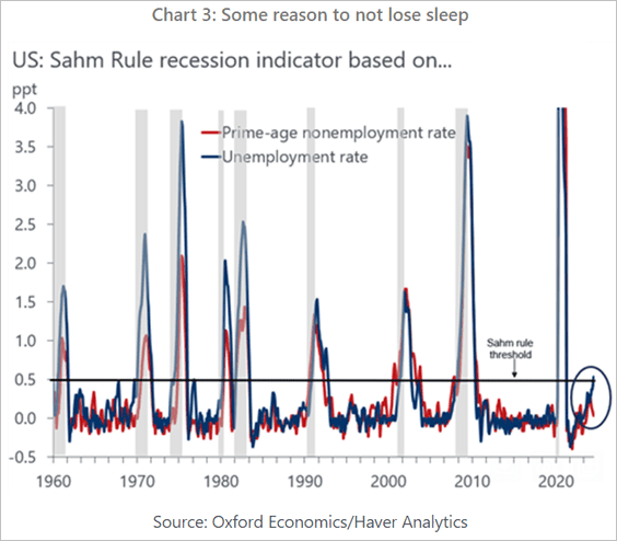 E per dirla tutta su come le previsioni a seconda del modello cambino ad ogni stormir di fronte è stato pubblicato un grafico con la modifica dell’indicatore di recessione Sahm Rule dal nome di una graziosa economista della FED (non mi chiedete i dettagli perché non li conosco, ricordo solo la signorina che ha inventato la regola e vi so dire che è sicuramente gradevole) e con la modifica la risposta del modello è l’opposto di quella senza modifica (no recessione con la modifica mentre indica recessione nell’altro). La modifica consiste nel considerare la disoccupazione totale oppure quella della prime – age.