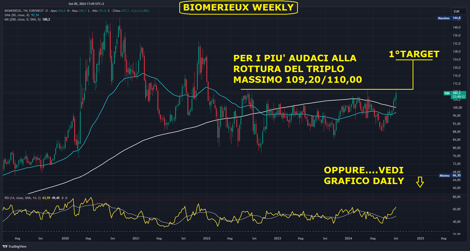 Ieri, giovedì 5 settembre, il titolo francese BIOMERIEUX ha chiuso a 107,30 € guadagnando il +4,17% sulla chiusura della seduta precedente, con un’apertura in gap, registrando uno dei maggiori aumenti dell’indice SBF 120, dopo che il gruppo ha presentato risultati semestrali superiori alle aspettative con una solida dinamica delle vendite nel secondo trimestre e margini robusti. Dopo questo primo semestre eccellente in termini di crescita delle vendite, l'azienda ha alzato i suoi obiettivi per il 2024 diventando una delle rare aziende ad aumentare i propri obiettivi semestrali.