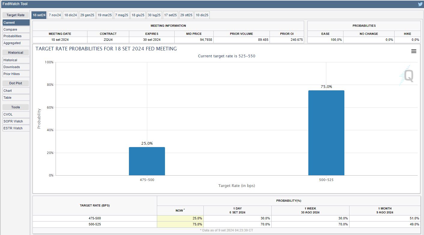 Lo strumento FedWatch del CME Group mostra un aumento delle probabilità del primo taglio dei tassi nella riunione del 18 settembre rispetto alla scorsa settimana per un taglio di 25 bps che passano dal 69,0% di due venerdì all’attuale 75,0%, a discapito ovviamente per quelle di un taglio di 50 bps che dal 31,0% di due venerdì fa, passano all’attuale 25,0%. Non sono quotate altre opzioni (v. grafico):