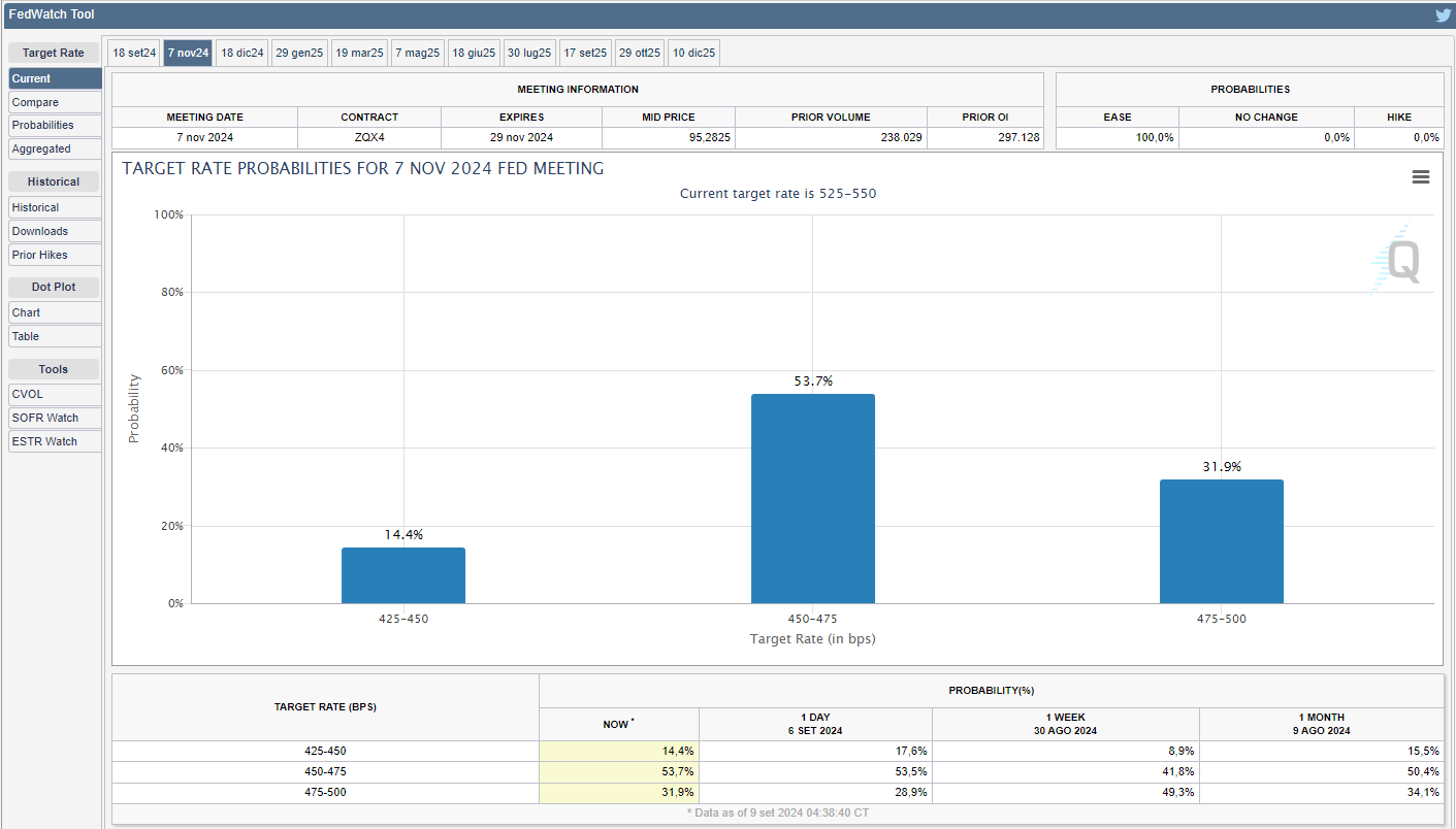 E veniamo alla scadenza relativa alla riunione del 7 novembre. Nella quale ritornano a comandare le probabilità di un taglio per complessivi 75 bps (50 bps o due da 25 bps) che con un gran balzo passano dal 41,8% di lunedì scorso passano all’attuale 53,7%. Ovviamente a scapito delle probabilità di un taglio per complessivi di soli 50 bps (1 da 0,50% o uno da 0,25%) che dal 49,4% di lunedì scorso si abbassano all’attuale 31,9%. Infine si alzano leggermente al 14,4% le probabilità di un taglio di un punto percentuale (0,50% + 0,50% troppo ottimistico), rispetto all’8,8% di lunedì scorso (v. grafico):