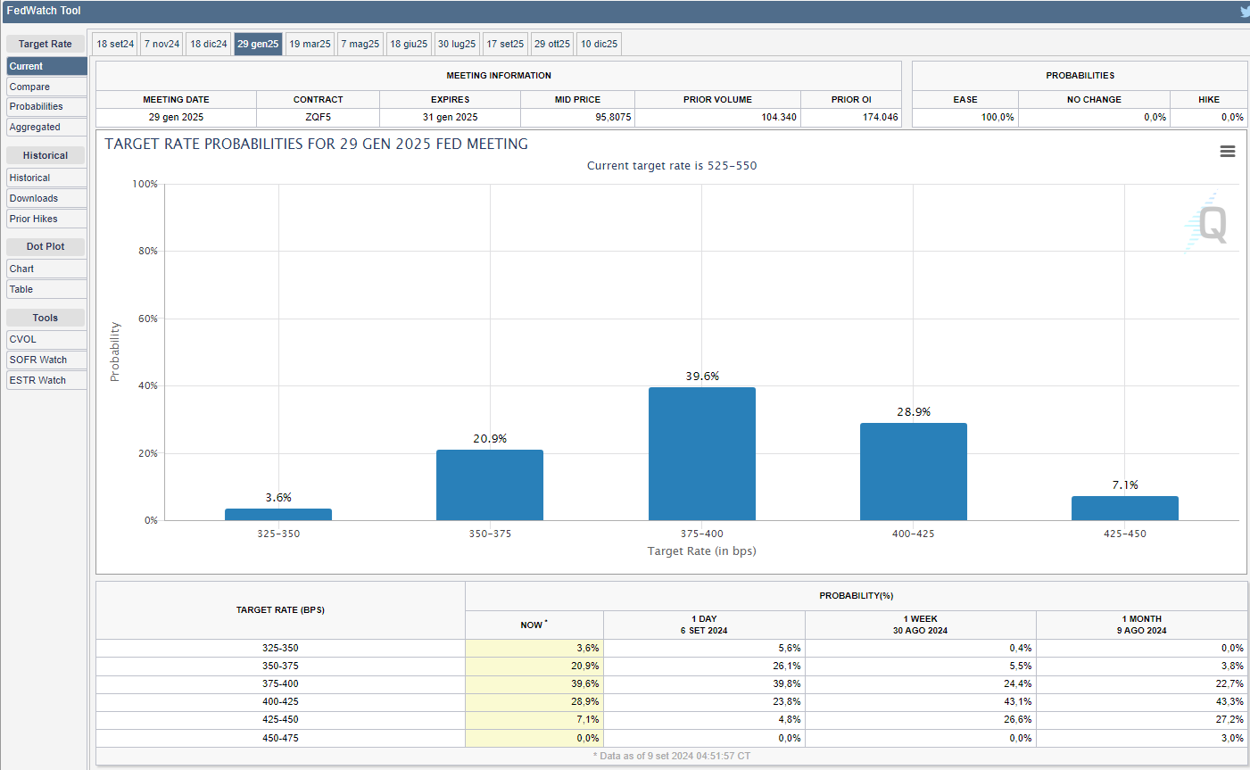 Andiamo ora a vedere nello specifico il mercato dei futures sui Fed Funds che sembrano essere al passo con la probabile decisione della FED, almeno per quanto riguarda il primo taglio dei tassi nella prossima riunione di settembre.