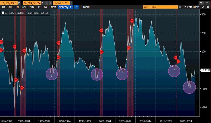 Questo in quanto nella totalità dei casi precedenti la disinversione è dipesa dalla corsa del mercato a scontare tagli della FED, che è un po' quello che sta succedendo ora, nel 1990, nel 2000 e nel 2007 non fu sufficiente ad evitare la recessione. Nel 2020 questa fu eradicata dall'esplosione dello stimolo fiscale e monetario post Covid. Comunque una manciata di bps non contano, per cui rimandiamo l'analisi a quando avremo un movimento congruo e confermato.