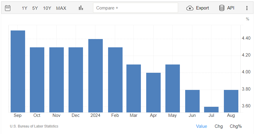 Il tasso di disoccupazione nel mese di agosto si attesta al 4,2%, come indicato dal consensus ed in lieve calo rispetto al 4,3% registrato a luglio. Il dato è rilasciato dall’U.S. Bureau of Labor Statistics.