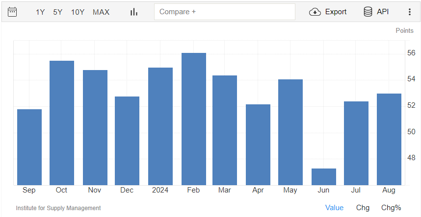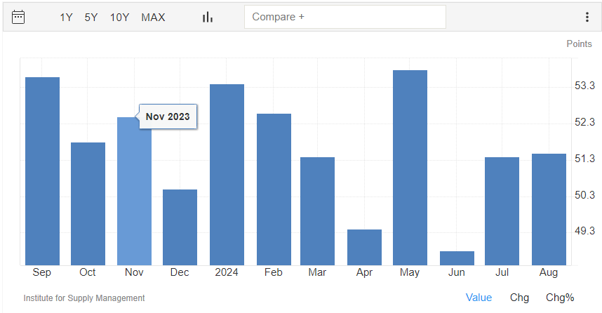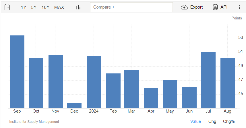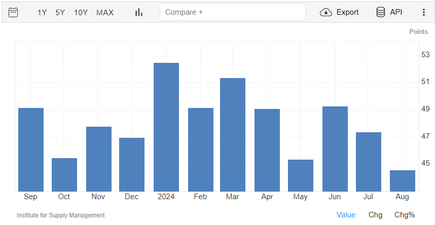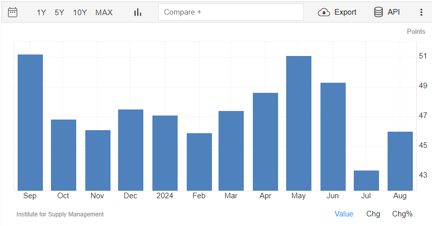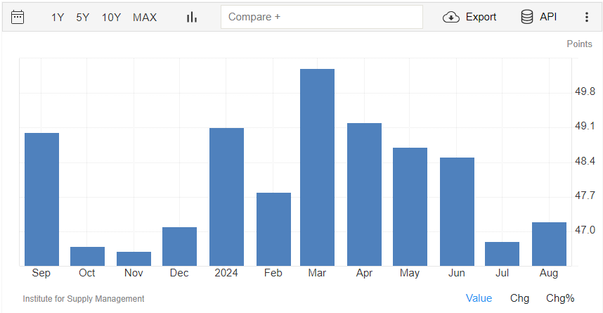 Il dato PMI relativo al settore manifatturiero rilasciato da ISM, invece, ad agosto si attesta a 47,2 punti, qualche punto sopra alla rilevazione di luglio di 46,8, ma sotto al consensus di 47,5 rimanendo sotto la soglia di contrazione in 21 degli ultimi 22 mesi (unica eccezione il 50.3 di marzo 2024).