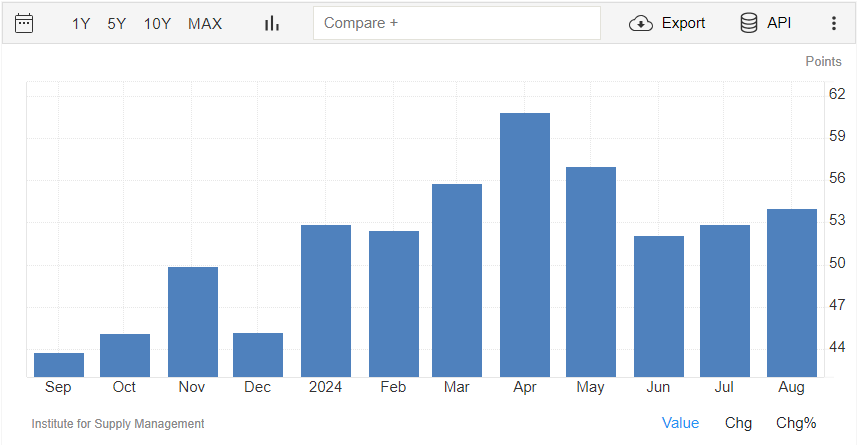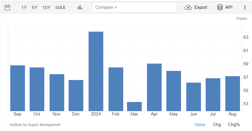 Il dato sui prezzi nel settore dei servizi rilasciato da ISM, invece, ad agosto si attesta a 57,3 punti, in leggera crescita rispetto ai 57,0 punti di luglio e sopra al consensus di 56,0 punti.