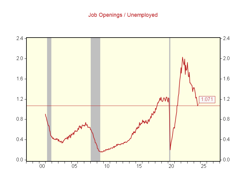 E' vero che storicamente l'unico periodo pre Covid in cui il ratio ha ecceduto il livello di un offerta per disoccupato è stato per un paio d'anni nel 2018-19. Ma, oltre al livello, è il trend che rileva, e un ritorno sotto 1 dopo 6 anni passati abbondantemente sopra può avere effetti imprevedibili sull'occupazione e sulla percezione del mercato del lavoro da parte dei consumatori, con eventuale impatto sui consumi (v.grafico):
