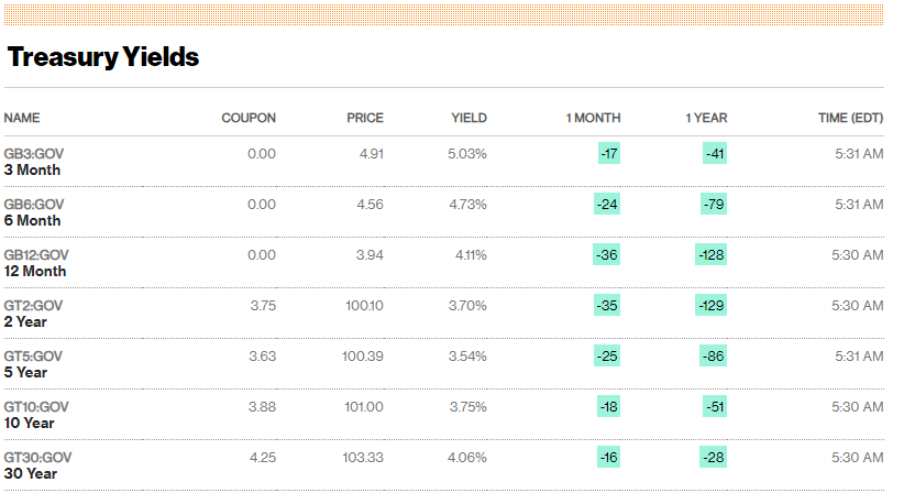 Ribasso anche per il rendimento di riferimento del Treasury a 10 anni anche se di entità minore rispetto al 2Y, che dal 3,907% di due venerdì fa, passa al 3,712% della chiusura settimanale.
