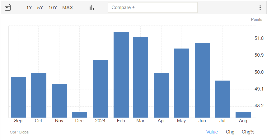 Il PMI S&P Global relativo al settore manifatturiero passa dal dato di 49,6 punti di luglio a quello di agosto di 47,9 punti, appena sotto al dato preliminare di 48.