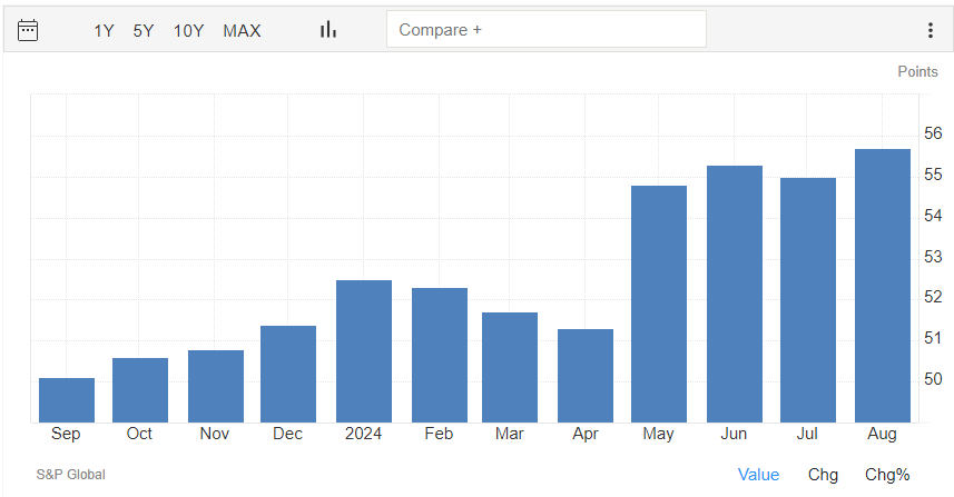 Il PMI S&P Global del settore dei servizi ad agosto è pari a 55,7 punti, rispetto ad un dato preliminare di 55,2 punti ed in crescita rispetto alla rilevazione di 55,0 punti di luglio.