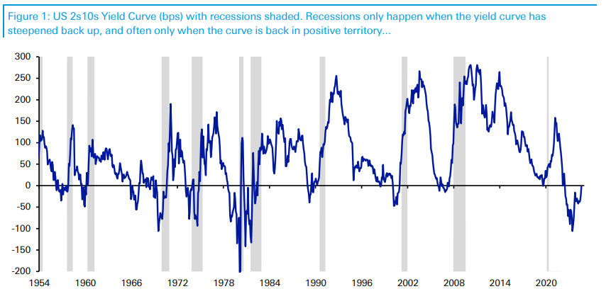 Deutsche Bank è tornata sull'argomento con un grafico, evidenziando come sia la disinversione a condurre alla recessione e non l'inversione, che però è un elemento necessario: