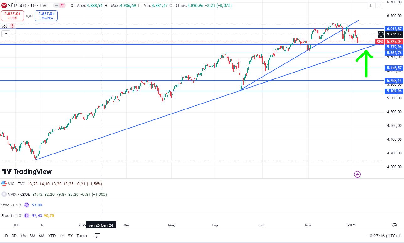 Buon fine settimana a tutti. Quella che si è conclusa è stata una settimana delicata per i principali listini azionari e si è palesata in modo ancor più evidente la dicotomia tra Europa e Stati Uniti già indicata sabato scorso (link articolo: https://www.lombardreport.com/2025/1/4/azioni-edison-bond-eu-2053/). La scorsa ottava vi avevo lasciati nel dubbio che l'S&P500 stesse formando una sorta di testa e spalle ribassista. Per chi mi segue da anni sa che NON attribuisco alcuna specifica valenza alle figure di analisi tecnica e NON mi baso SOLO sull'analisi tecnica per decidere se entrare o meno in posizione (long o short naturalmente). Detta in poche parole, considero l'AN (che non è l'ex partito politico ;-)) un semplice tool che probabilmente esprime la psicologia degli operatori nel loro insieme, ma il grafico è di per sè un qualcosa di già vecchio, sia che sia daily, sia che sia a 5 minuti o al secondo. Fatta questa lunga e forse un pò inutile premessa, torniamo all'S&P500 che sul daily sta cercando di bucare un supporto statico che permetterebbe la chiusura del "famoso" gap up creatosi con l'elezione di Trump. Rispetto al close di venerdì@5827 punti c'è spazio di discesa fino a 5780 circa e forse più in giù. AL MOMENTO ritengo che solo una risalita sopra i 6012 punti (massimi settimanali) potrebbe invalidare il quadro attuale volto ad una sostanziale debolezza. La volatilità è sì in salita ma senza un vero e proprio panico e questa mi fa propendere per un consolidamento/assestamento e -al momento- non-ancora- per una vera e propria inversione di tendenza.