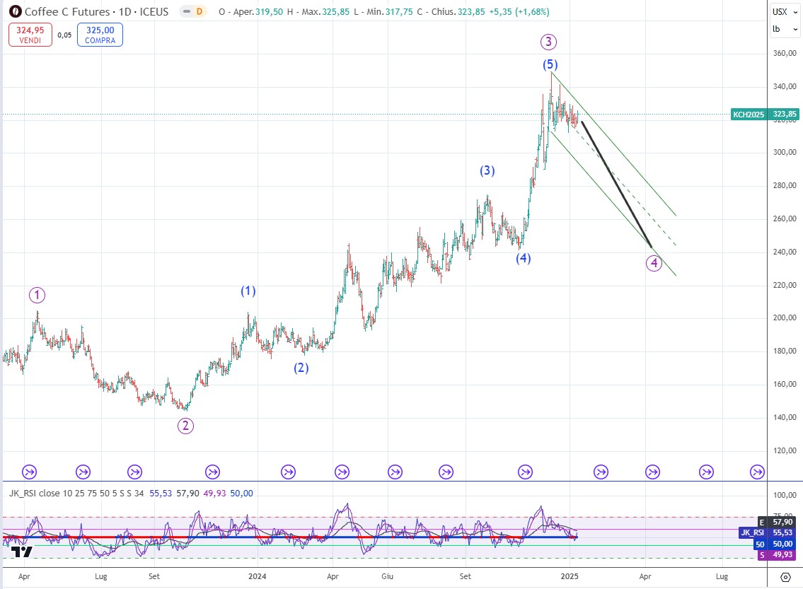 Il caffè è alle prime battute di un’onda quarta che dovrebbe riportare i prezzi attorno ai livelli dell’onda quarta di grado precedente che nello specifico è l’onda (4).