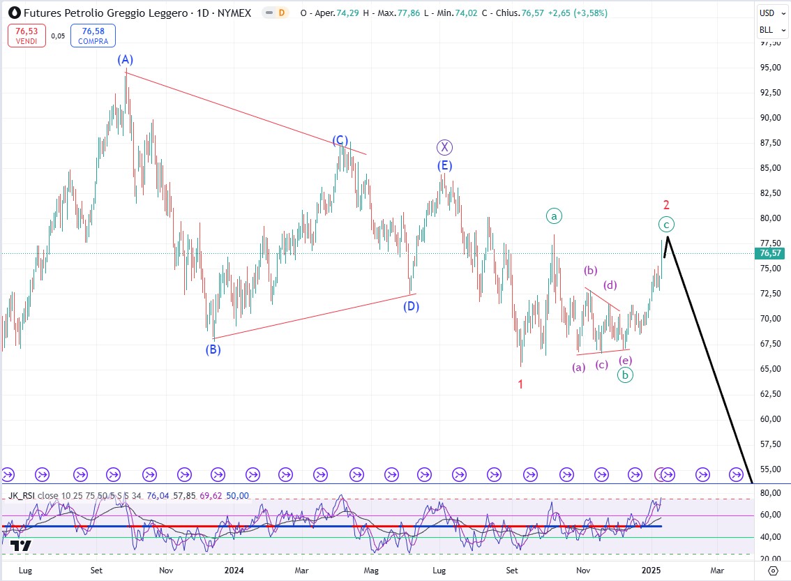 Il greggio a sua volta si trova a un bivio nel senso che se si completa l’onda 2 nei dintorni del massimo di onda [a] il modello ribassista rimane in piedi e la prossima onda sarà una terza ribassista che proseguirà nella modellazione di quella che alla fine dovrebbe essere l’onda [Y] del doppio zigzag. Viceversa se i prezzi andranno più in alto attaccando il massimo di onda [X] allora il modello attuale sarà invalidato e dovremo rivedere i conteggi.