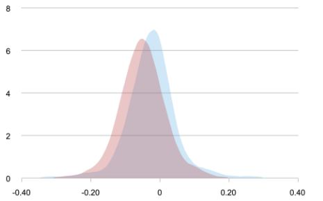 Il grafico sottostante traccia la distribuzione dei rendimenti azionari giornalieri per le aziende non esposte (curva blu) e per le aziende esposte (curva rossa). Le aziende esposte hanno subìto perdite relativamente maggiori rispetto alle aziende non esposte nei giorni degli annunci tariffari, come mostrato nel grafico seguente con la distribuzione dei rendimenti per le aziende esposte a sinistra di quelle non esposte. È interessante notare, forse sorprendentemente, che anche la distribuzione delle aziende non esposte si è spostata a sinistra.