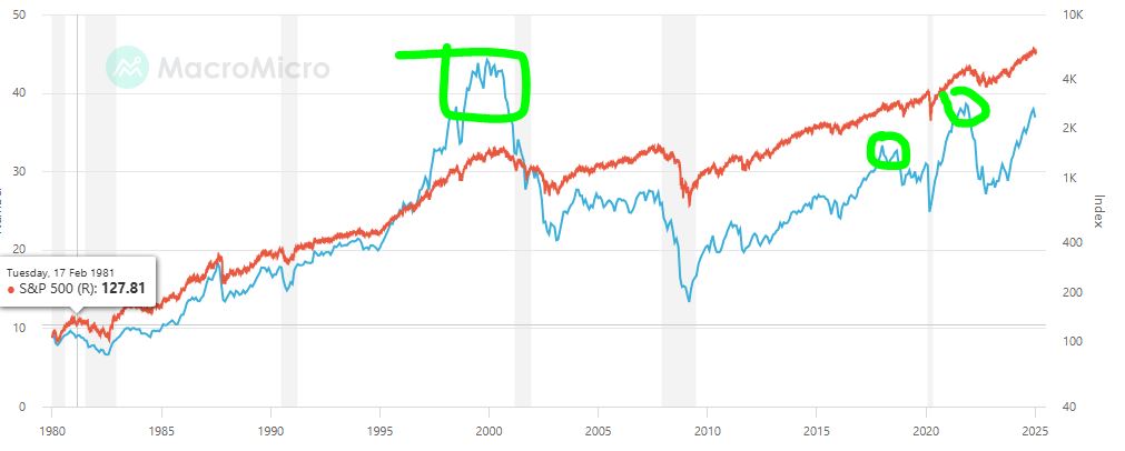 Confrontando l'S&P500 con l'indice di Shiller (CAPE) si vede chiaramente come valori particolarmente elevanti abbiano portato a ritracciamenti dell'indice (cerchi verdi). Chiaramente in questo caso si ragiona per eccessi.