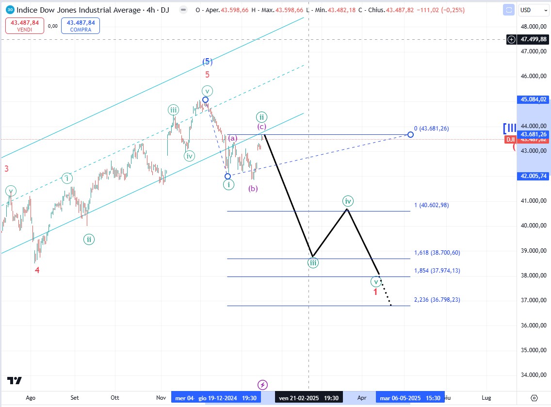 Anche il Nasdaq 100 venerdì ha fatto un bel recupero rompendo di misura il canale di onda 2 ed anche in questo un’onda (iii) ribassista sembra pronta a partire, ma non possiamo escludere che prima di farlo l’indice voglia salire ancora un po'.
