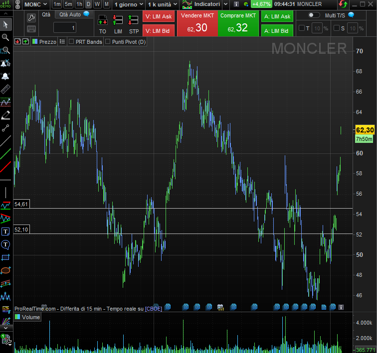 Un esempio concreto di come l’analisi tecnica possa guidare gli investimenti con maggiore sicurezza è rappresentato dall’azione Moncler. Nell’ottica di un investimento calibrato e prudente, si possono identificare due argini tecnicamente significativi.