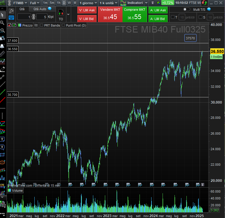 Un esempio emblematico è rappresentato dagli indici europei e statunitensi. In questo primo scorcio di 2025, abbiamo assistito a un’applicazione quasi scientifica dell'analisi tecnica, con il DAX tedesco che ha raggiunto nuovi massimi storici nonostante dati macro davvero brutti e il FTSE MIB italiano ha superato di slancio i 36.300 punti e raggiunto uno dei target revisti ai 36550, puntando, se anche questo target venisse "bucato", verso il target di 37.570 punti. Questi movimenti non sono stati casuali, ma rispondono perfettamente ai segnali forniti dagli indicatori tecnici e vengono percorsi anche con bassissimi volumi di scambio.