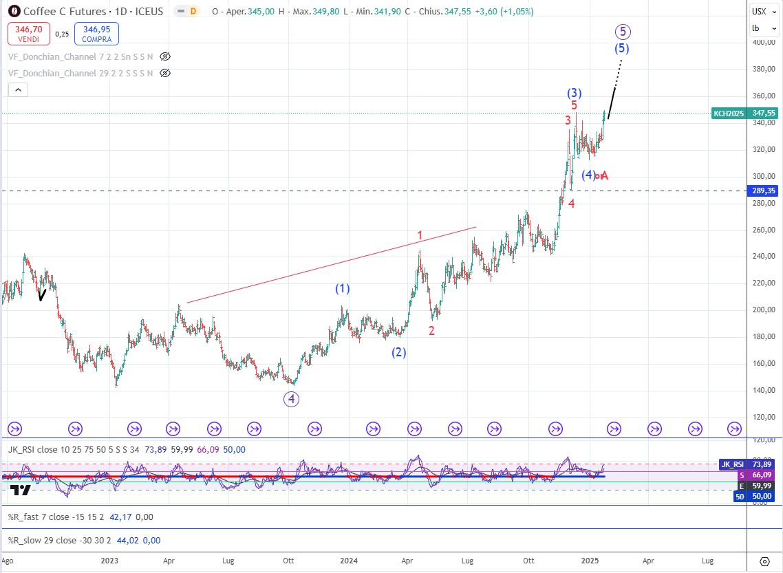 Il caffè mette a segno un nuovo massimo di misura millimetrica ma sufficiente per costringerci a ritoccare il conteggio. Se siamo già in onda quinta i prezzi potrebbero raggiungere tranquillamente la zona dei 380$ ed eventualmente da lì spingersi ulteriormente al target successivo attorno ai 410$. Se al contrario invece dell’onda (4) si trattasse solo della A di (4) allora i massimi attuali potrebbero essere l’onda B e dopo mancherebbe la C ribassista che ci riporterebbe nella situazione descritta la settimana scorsa, lasciando comunque quasi inalterato il target di onda (5).
