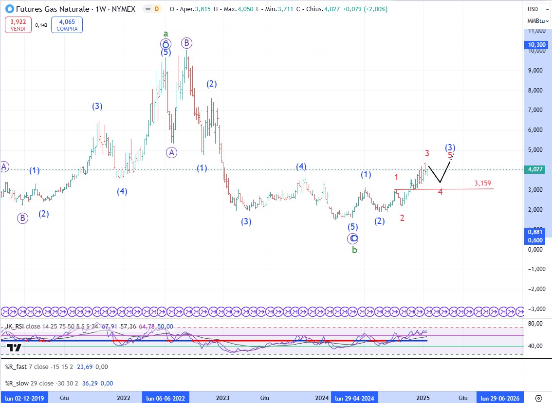 Il gas naturale deve suddividere ancora per completare l’onda (3), per cui non siamo ancora sull’onda 5 come avevo scritto la scorsa settimana. Ora vediamo se sviluppa l’onda 4.