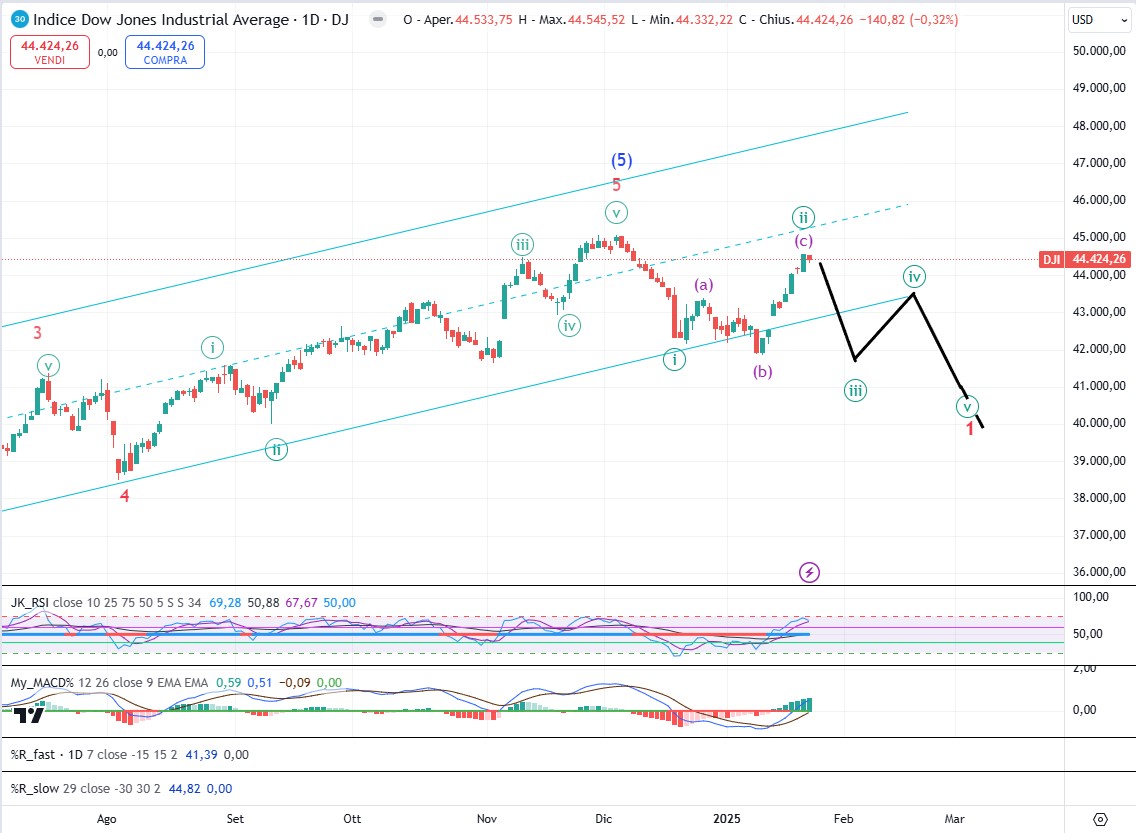 Il Dow Jones con la seduta di giovedì scorso è risalito a 44.565,20 punti. Se l'avanzamento dal 13 gennaio è l'onda (c) di grado Minuette dell'onda [ii] di grado minute allora quest’ultima, dovrebbe essere completa o quasi. Se è così i prezzi dovrebbero iniziare a scendere con l’onda [iii]. Tuttavia non possiamo dimenticare che nel frattempo l’S&P500 ha fatto un nuovo massimo e di solito gli indici si confermano a vicenda per cui se uno salisse mentre l’altro scende sarebbe una divergenza piuttosto inconsueta. Questo periodo dovrà essere monitorato con molta attenzione.