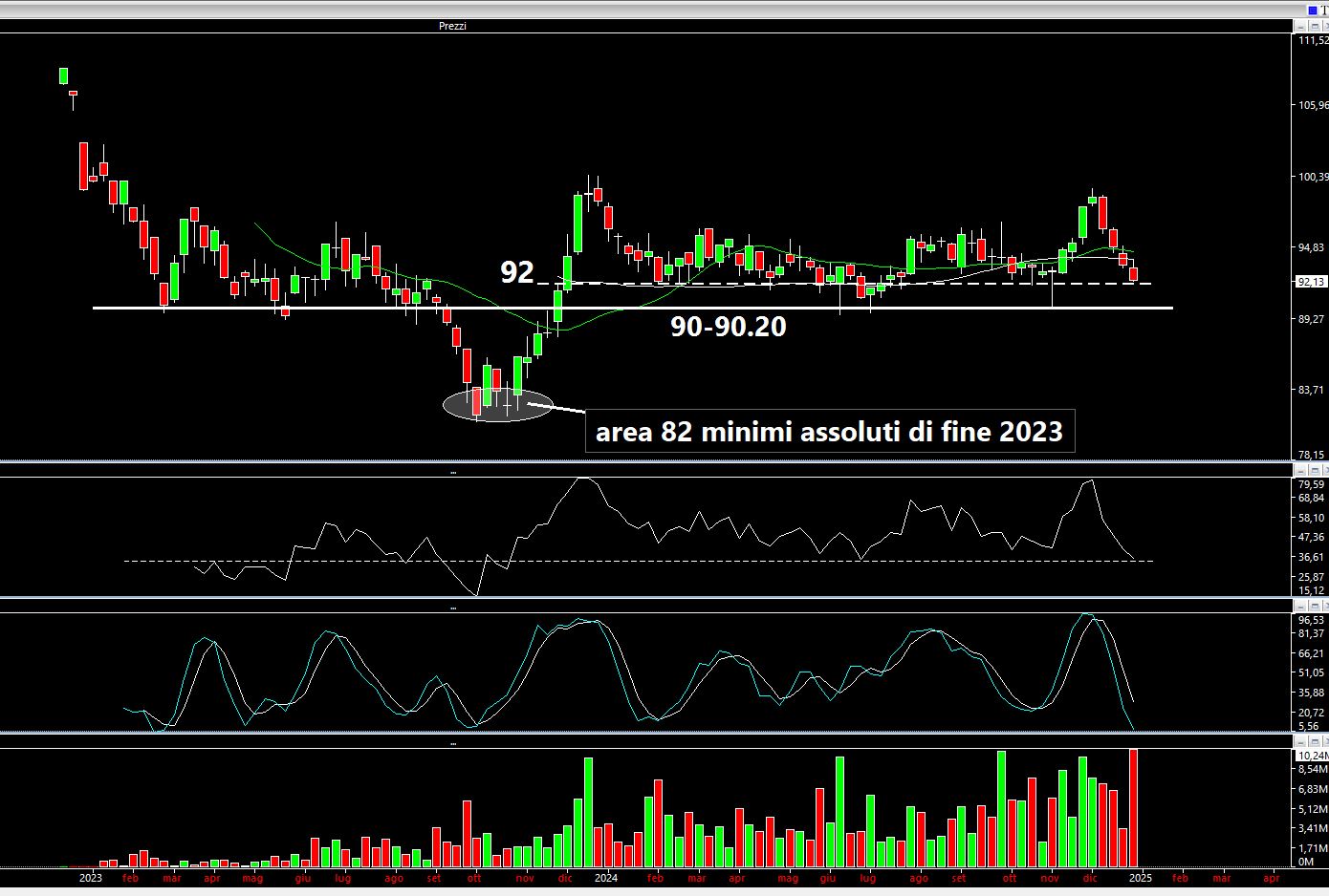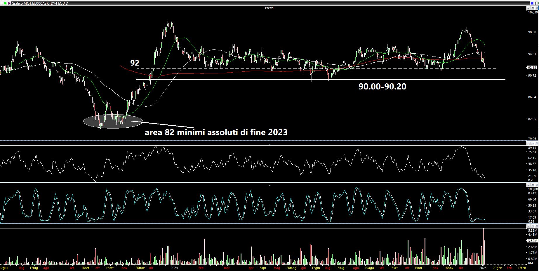 Quanto al Bond EUR 2053 3% con ISIN EU000A3K4DY4 notiamo come abbia raggiunto l'area 92 la cui rottura potrebbe portare ad una ulteriore accelerazione verso l'area critica collocabile attorno a 90-90.20. Se l'obiettivo è quello del trading la size, vista la scadenza lunga (28 anni), deve essere estremamente modesta. A titolo di esempio, pensiamo di voler destinare il 5-6% del solo portafoglio obbligazionario alla parte iper speculativa (che comunque è una tripla A e non una obbligazione senza rating seppur con una durata lunga e la cui volatilità è paragonabile ad un derivato): la prima tranche deve essere leggerissima (1%???), la seconda leggermente maggiore (2%???) e la terza coprire il residuo (3%???). Così facendo il prezzo medio di carico tenderebbe verso il basso. Su eventuali rimbalzi sarebbe opportuno alleggerire la parte del 3% e lasciare il resto (salvo poi rientrare successivamente). Personalmente non amo mediare, specialmente al ribasso e su uno strumento così volatile, ma considerando anche l'ipotesi di andare a 82 punti credo che grossi danni non se ne farebbero utilizzando size piccole (personalmente dubito possa tornare a 82-83 quando i tassi dell'area euro hanno raggiunto i massimi). Poi tutto è possibile come la Borsa insegna QUOTIDIANAMENTE e lo sapete meglio di me: l'Europa può essere declassata, qualche Stato potrebbe indire un referendum e uscirne (BREXIT docet), può saltare l'UE, etc., etc.... Però personalmente non mi dispiace l'idea di un rendimento netto fissato al 3% su una tripla A per qualche mese (difficilmente avremo movimenti a "V"),con cedola del 3% che viene naturalmente calcolata sul nominale (100) e non sui 92 pagati (in altri termini ogni mille pezzi acquistati ovvero mille euro è come se costassero 920 euro circa). Naturalmente sono mere considerazioni e NON sollecitazioni all'investimento o all'acquisto, come sempre del resto: spunti di riflessione, niente di più.