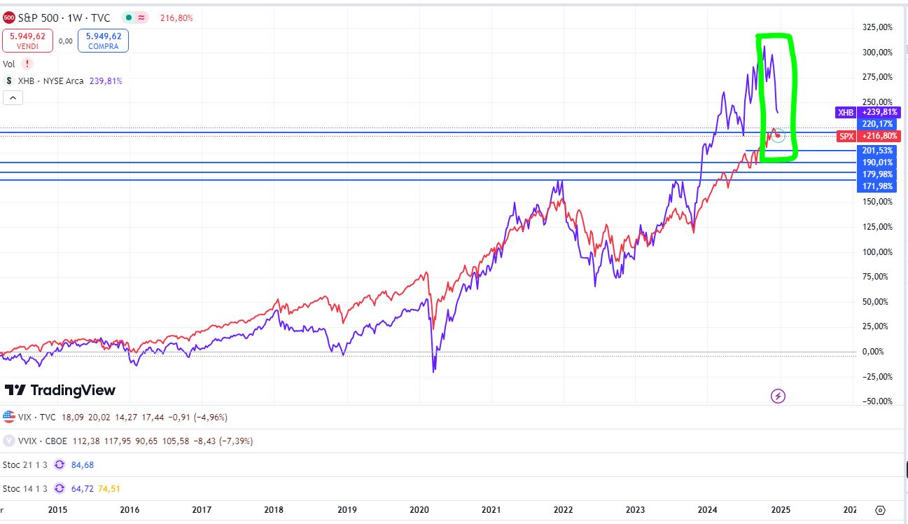 Un aspetto da non sottovalutare è la forte correlazione dell'S&P500 con l'ETF homebuilders: un ribasso di quest'ultimo ha spesso (seppur non sempre) anticipato una correzione dell'indice. Nelle ultime sedute l'ETF (colore blu nel grafico di seguito) è sceso piuttosto violentemente mentre l'S&P (colore rosso) è rimasto in alto o comunque in area massimi, quindi cautela.