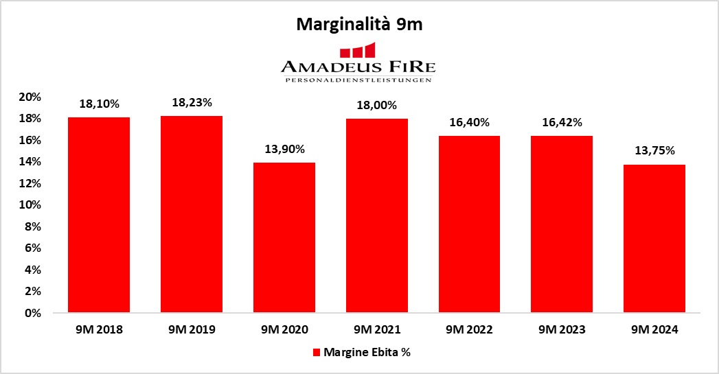Il settore HR è estremamente frammentato e comprende sia grandi multinazionali (ad esempio, RANDSTAD, ADECCO, MANPOWERGROUP) sia attori locali o di nicchia. Rispetto a queste aziende, il profilo di marginalità di AMADEUS FIRE è decisamente superiore rispetto ai competitor, grazie alla combinazione di un modello di business diversificato, un focus su segmenti premium e un'ottimizzazione dei costi. Sebbene nel 2024 si osservi una contrazione rispetto agli anni precedenti (dal 16,4% al 13,8% a livello di gruppo), AMADEUS FIRE rimane ben posizionata per mantenere un vantaggio competitivo sui margini, soprattutto con una possibile ripresa economica nel 2025.