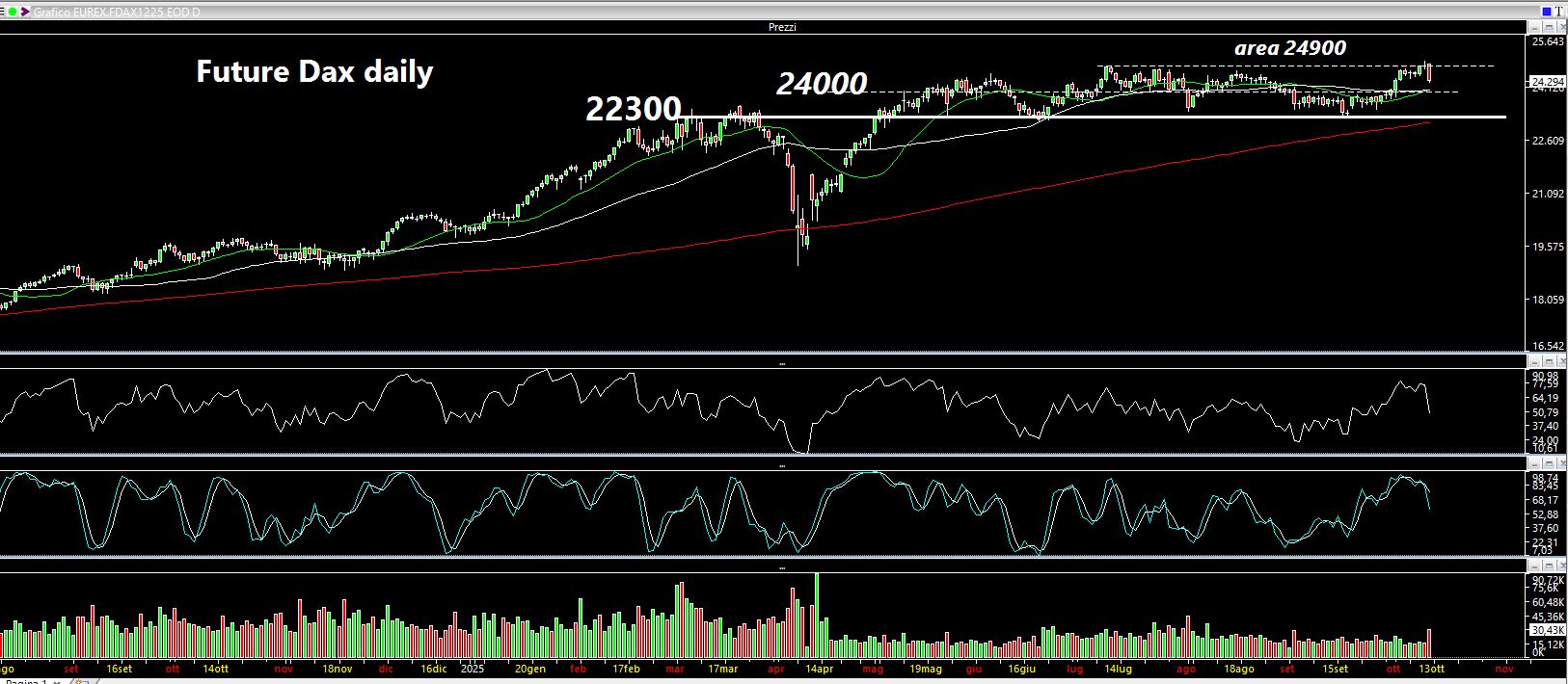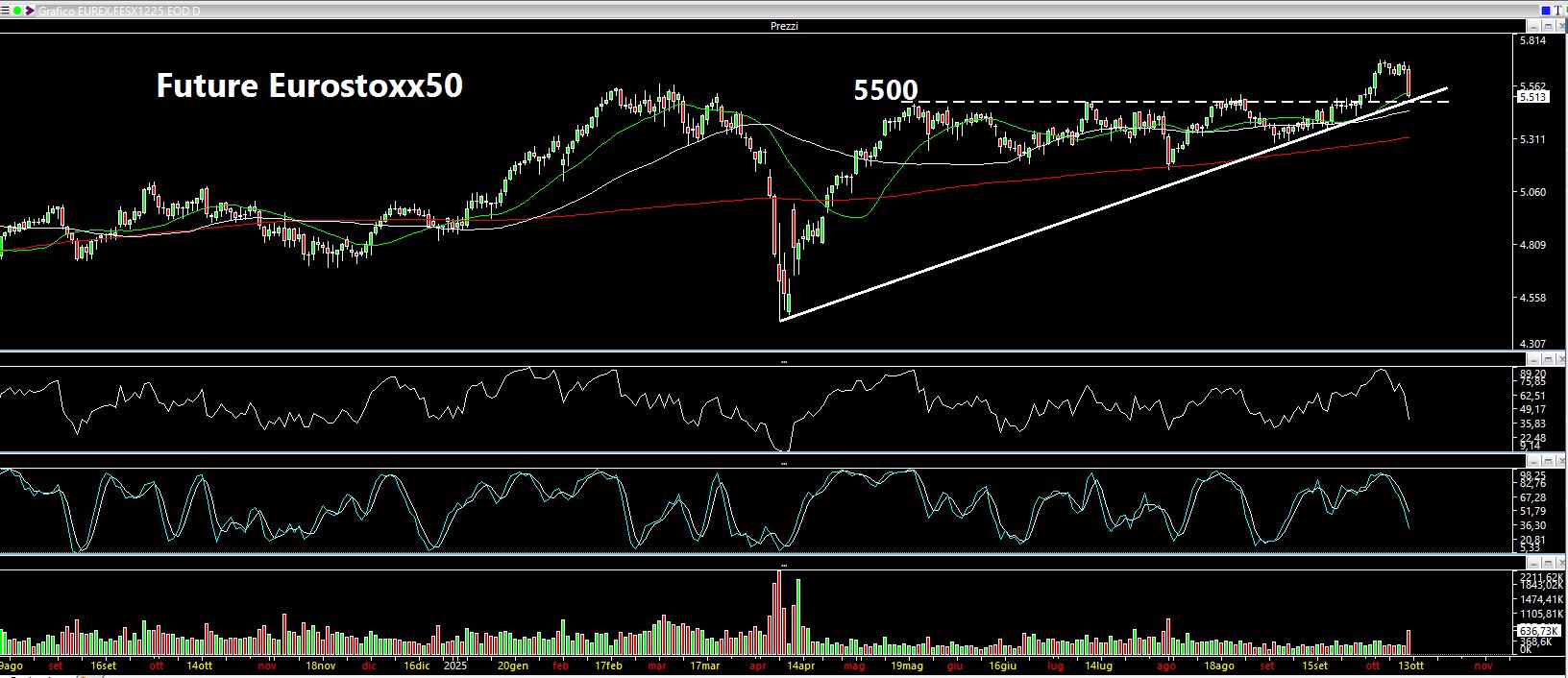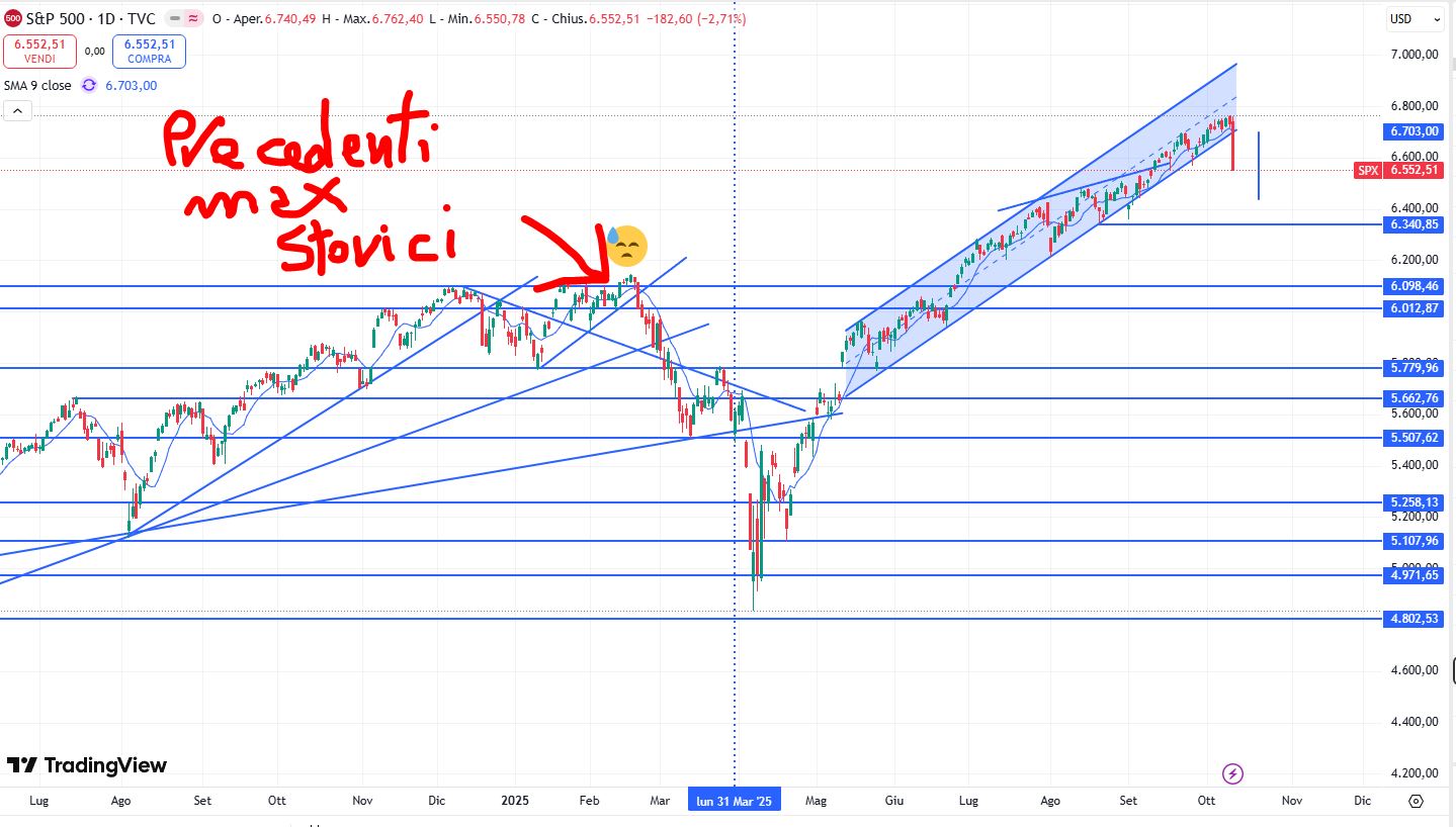 Ricordate il "famoso" canale tracciato sull'S&P500 che ha retto in modo molto lineare il rialzo da maggio di quest'anno (link: https://www.lombardreport.com/2025/9/28/se-brunello-dorme-tra-le-braccia-di-morpheus/)? Finalmente è stato rotto e ci siamo diretti a spron battuto verso i 6550 punti. Questo è certamente un micro supporto ma vista la candela e la forte volatilità di venerdì credo possa essere bucato come burro. Teoricamente l'analisi tecnica classica insegna che il target della rottura di un canale di trend è dato dall'ampiezza del canale stesso proiettata al rialzo o al ribasso dal punto di rottura. Nel nostro caso l'ampiezza del canale tracciato da svariate settimane a questa parte è stata di circa 250 punti. Se il punto di breakout è avvenuto venerdì a 6700 punti, ecco che il primo target teorico è a 6450 rispetto al close a 6552 (segmento blu). Personalmente ritengo ci sia un supporto attorno a 6340, anche se il vero livellone sarebbe il pullback dei precedenti massimi storici ovvero a 6100 punti circa....massimi storici che sono stati rotti a giugno di quest'anno e che hanno portato a questo lungo rally.