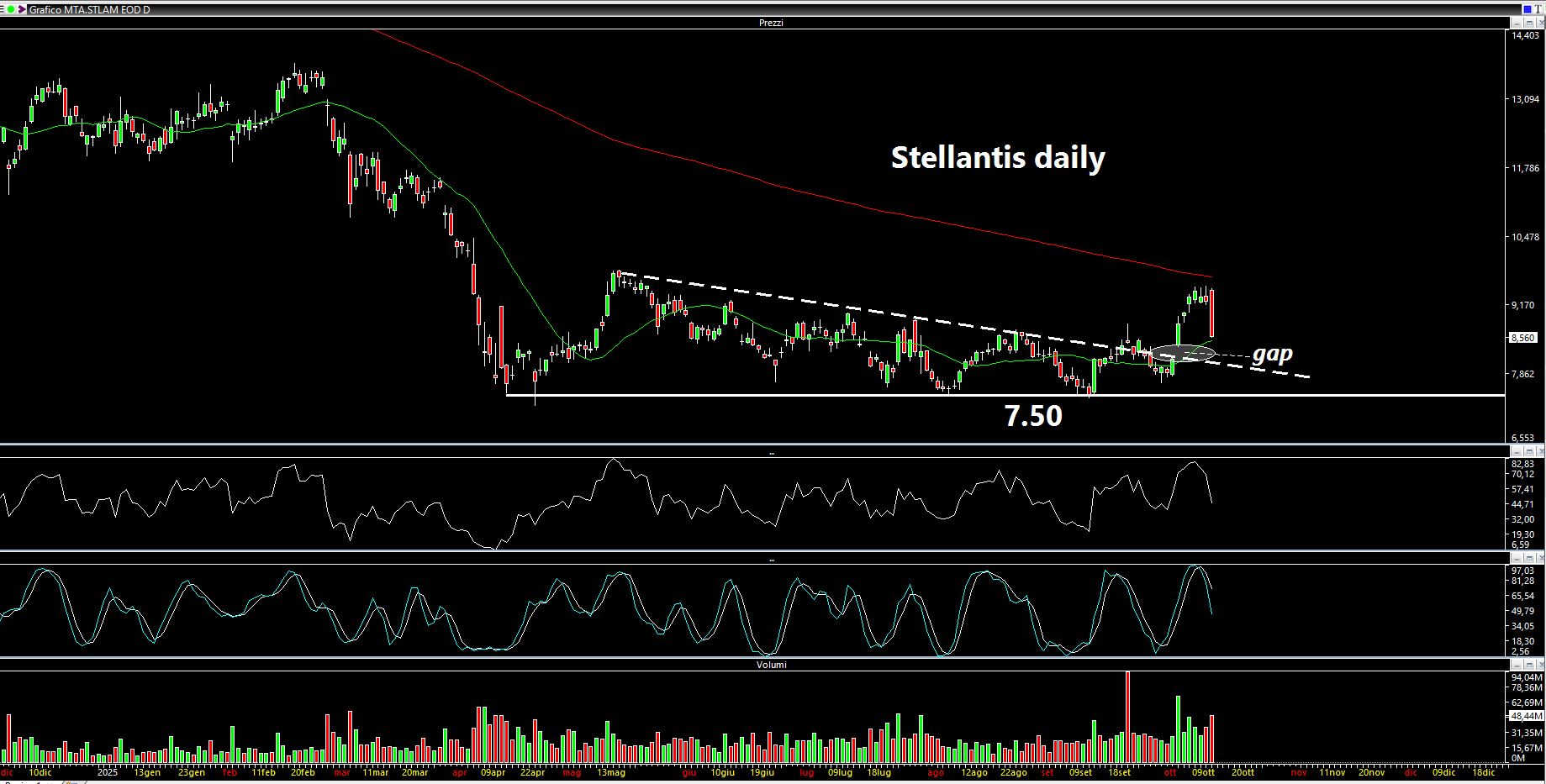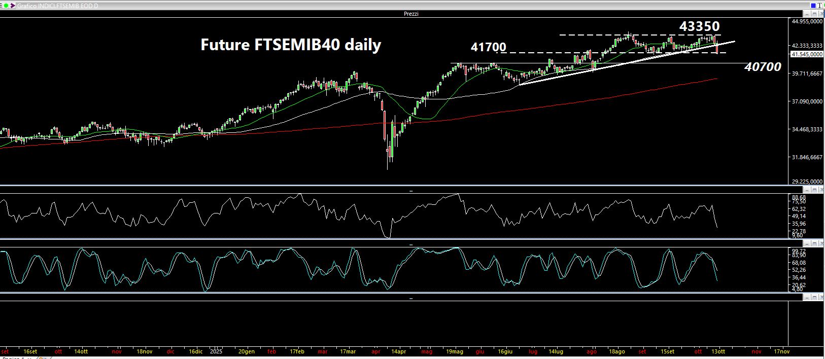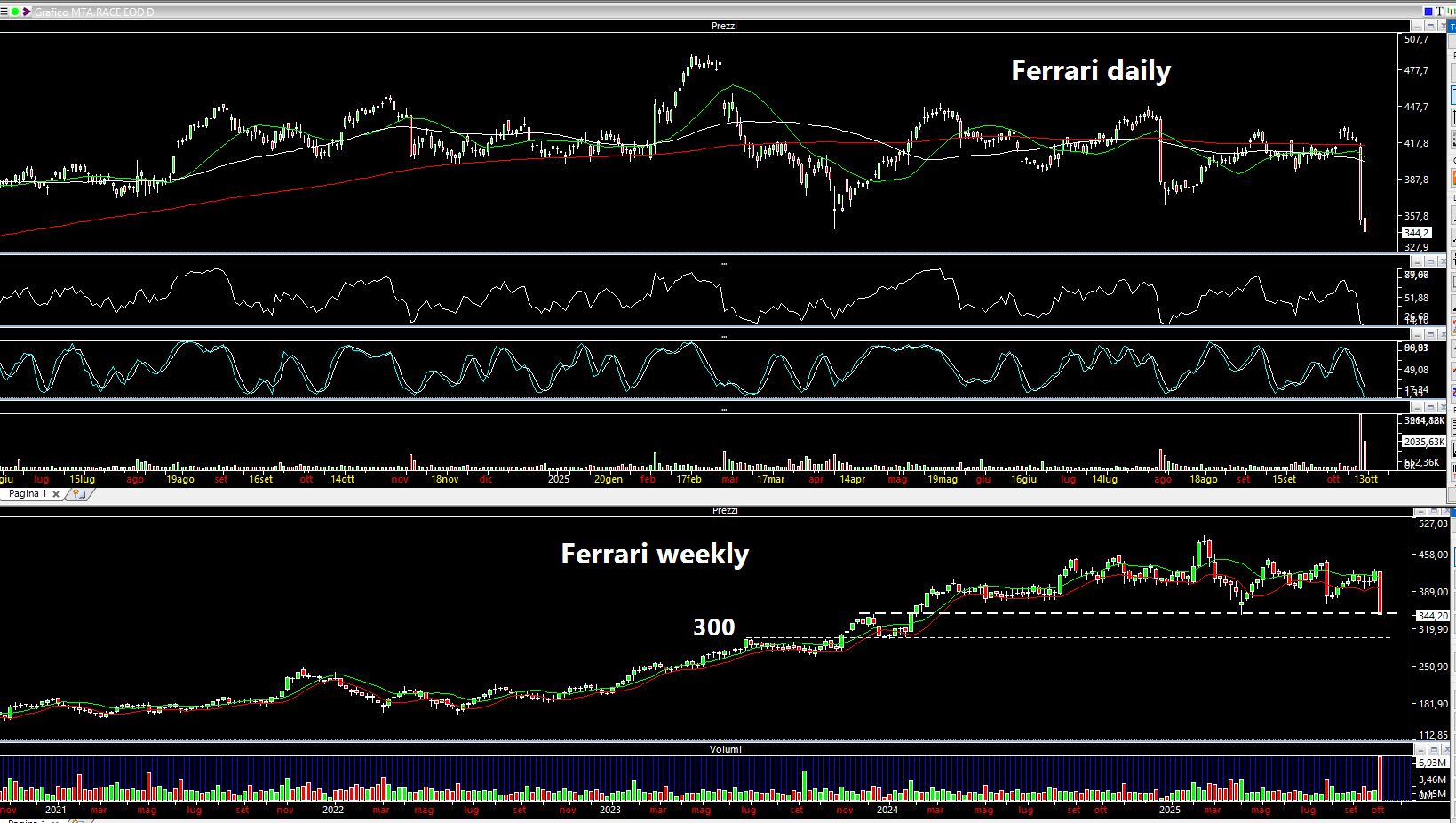 Ricordate il "famoso" canale tracciato sull'S&P500 che ha retto in modo molto lineare il rialzo da maggio di quest'anno (link: https://www.lombardreport.com/2025/9/28/se-brunello-dorme-tra-le-braccia-di-morpheus/)? Finalmente è stato rotto e ci siamo diretti a spron battuto verso i 6550 punti. Questo è certamente un micro supporto ma vista la candela e la forte volatilità di venerdì credo possa essere bucato come burro. Teoricamente l'analisi tecnica classica insegna che il target della rottura di un canale di trend è dato dall'ampiezza del canale stesso proiettata al rialzo o al ribasso dal punto di rottura. Nel nostro caso l'ampiezza del canale tracciato da svariate settimane a questa parte è stata di circa 250 punti. Se il punto di breakout è avvenuto venerdì a 6700 punti, ecco che il primo target teorico è a 6450 rispetto al close a 6552 (segmento blu). Personalmente ritengo ci sia un supporto attorno a 6340, anche se il vero livellone sarebbe il pullback dei precedenti massimi storici ovvero a 6100 punti circa....massimi storici che sono stati rotti a giugno di quest'anno e che hanno portato a questo lungo rally.